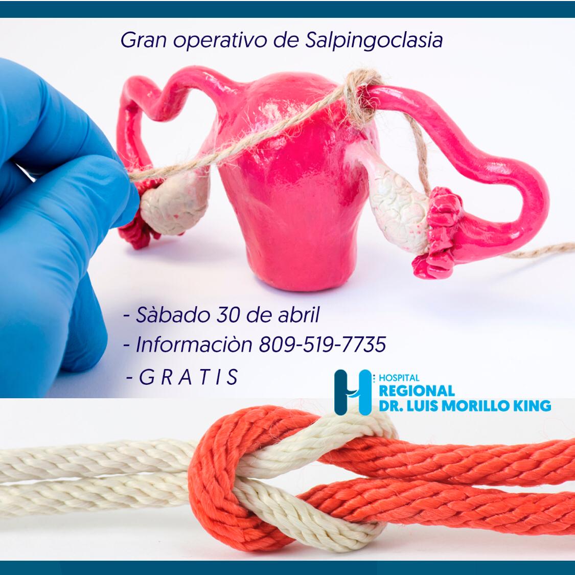 Operativo Salpingoclasia ? ATENCIÓN Gran Operativo de Salpingoclasia este sábado 30 de abril en el Hospital Regional Dr. Luis Morillo King. La Salpingoclasia es un método de anticoncepcion permanente o definitivo que se realizan las mujeres que tienen el número de hijos deseados y no quieren tener más embarazos. TOTALMENTE GRATIS MorilloKing SRSCC SNSRD